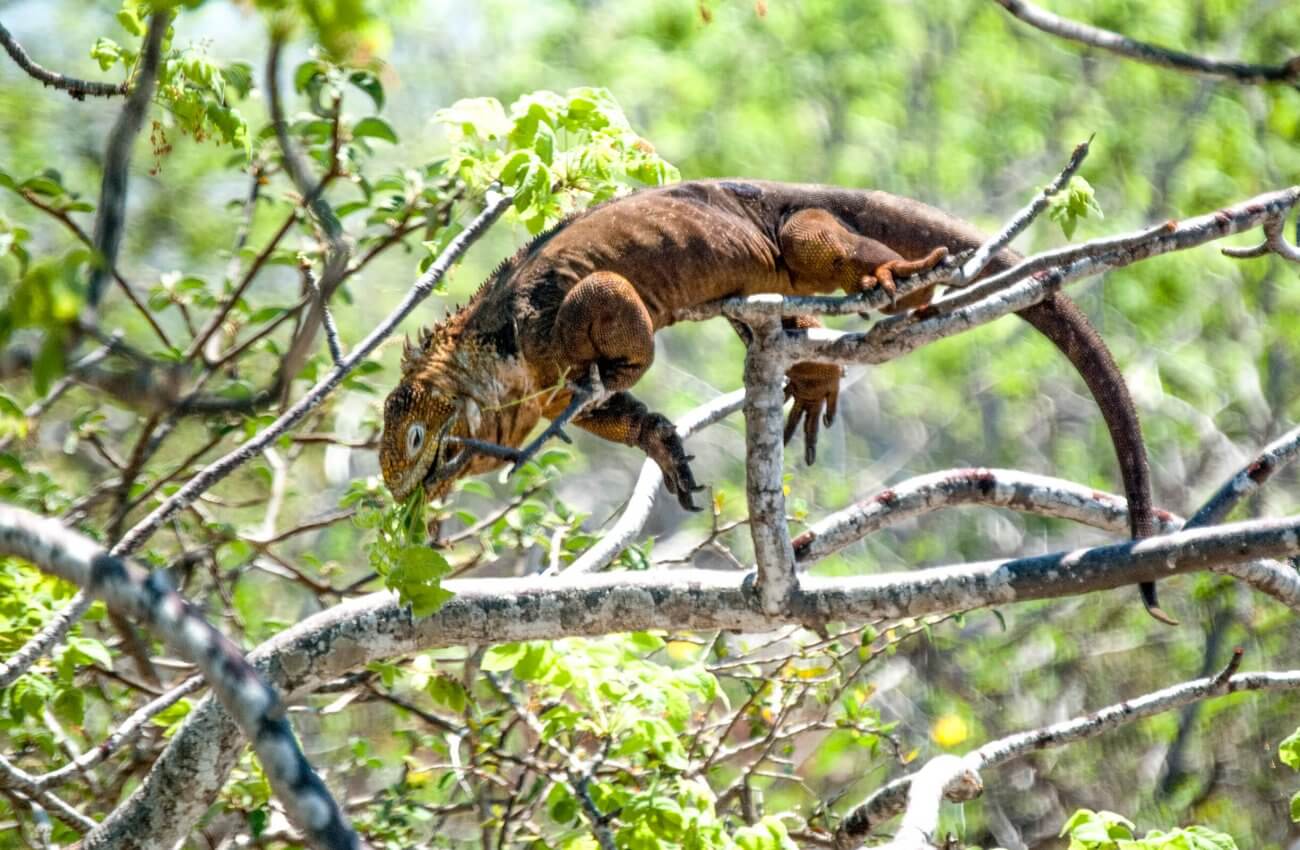 These iguanas have a distinctive yellow-orange color with brown backs. They eat primarily cactus pads, fruit and flowers and can be found on Baltra, Santa Cruz, Isabela and Fernandina Islands.